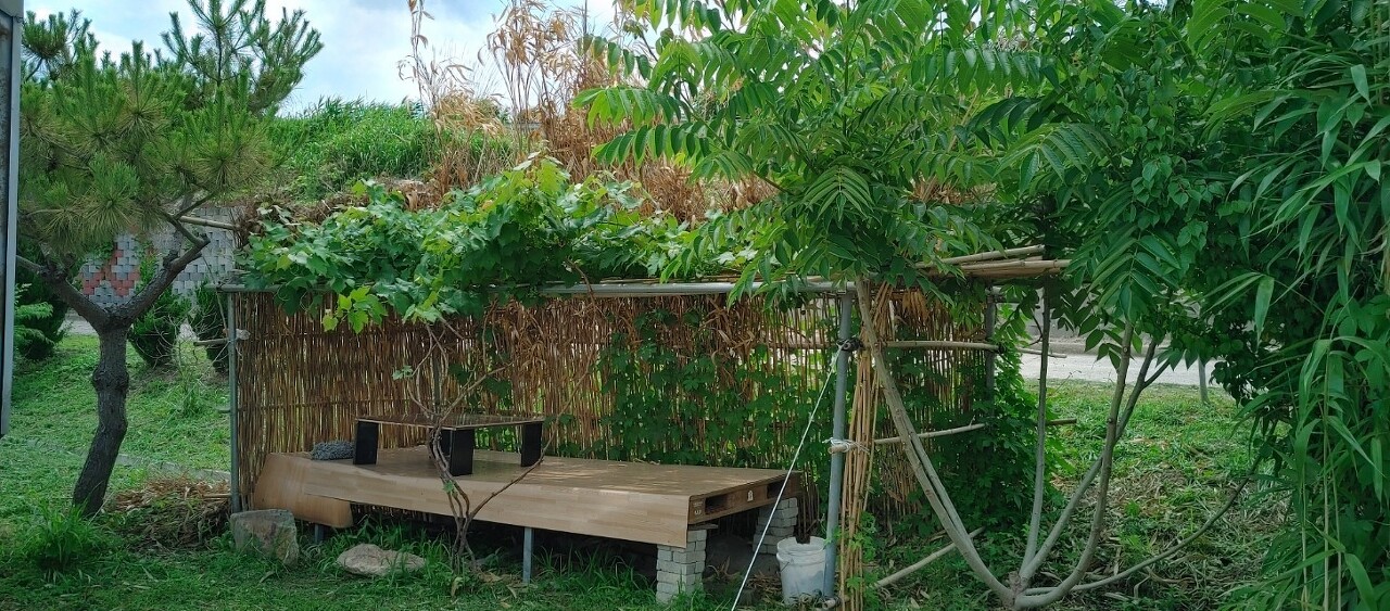 그늘막 좌측은 소나무 우측은 추자를 주워다가 직접 발아시켜 옮겨심은 가래나무로 그늘이 넓으니 시원합니다. 신우대 사이로 바람이 솔솔 불면 시원하게 낮잠좀 땡겨도 될 것 같습니다...^^