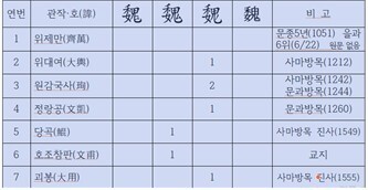 - 분석 : 고려조 문종부터 조선조 고종 간 68분의 선조님에 대한 국가사료에서 인명 표기 시 성씨를 성 자 11번, 삐침을 뗀 자 94번, 중국에서 주로 쓴 자 60번, 나라 魏자 7번 썼음을 확인했다. 기타 4분 선조님은 급제가 확인되나, 원문이 없어 성씨 표기는 확인할 수 없다.