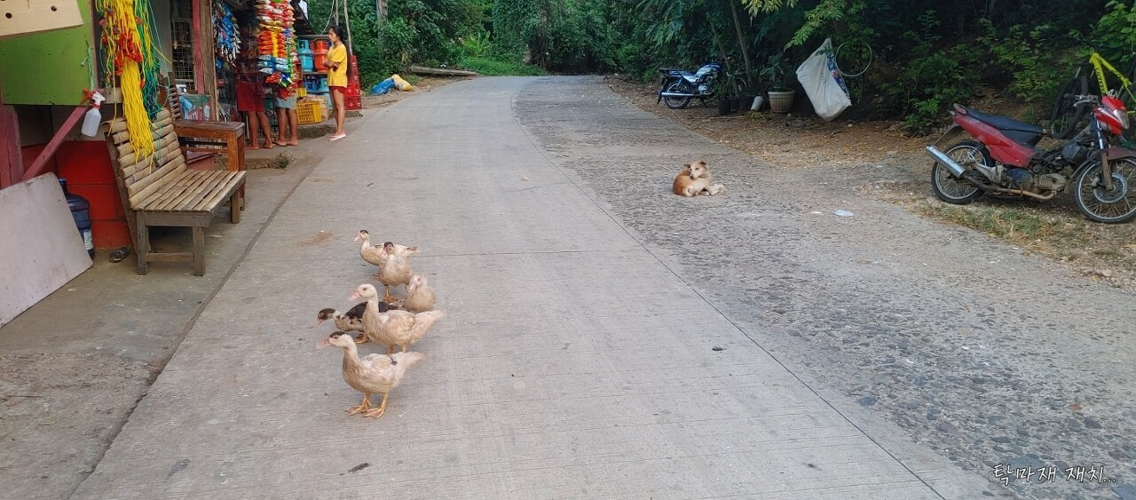 중간에 길을 막고 시위중인 오리떼와 그들을 보호중인 강아지...