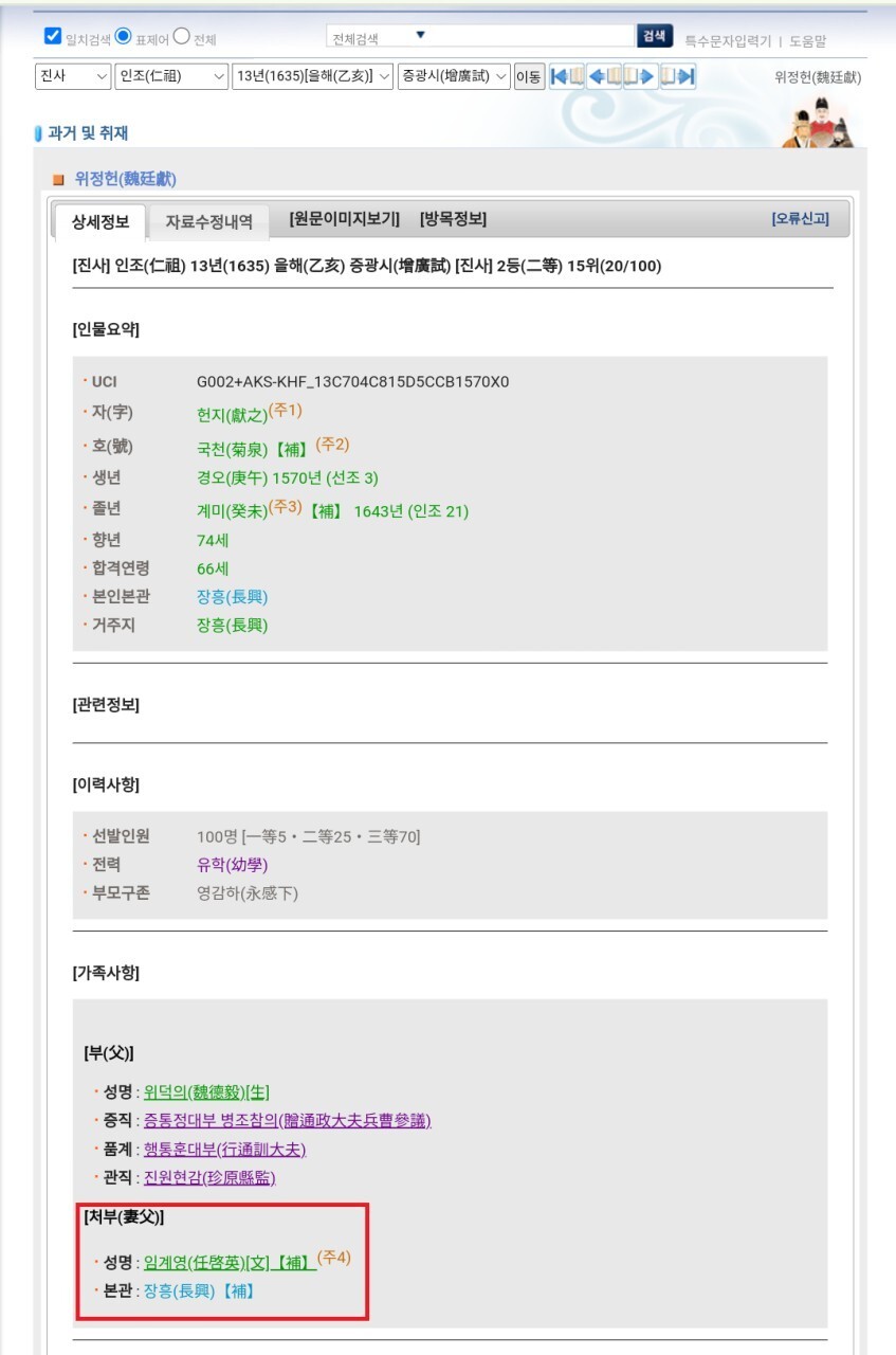 (선조3년 1570~인조 21년 1643) 향년 74세 자는 헌지(獻之),호(號)는 국천(菊泉). 본관은 長興 이괄의 난 때 병량(兵糧)을 모취하여 영광군수 원두를 도왔으며 정묘호란 때는 의병을 모집하였으나 화의가 성립되어 돌아왔다.병자호란때도 청주에 진병했다.66세 때(인조13년 1635년) 乙亥 增廣試(진사) 2等 15位(20/100)했다.父는 通訓大夫 行珍原縣監 청계(聽溪) 魏德毅이다.