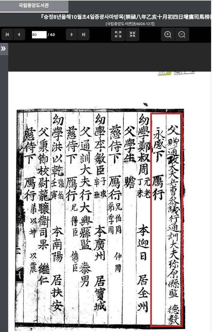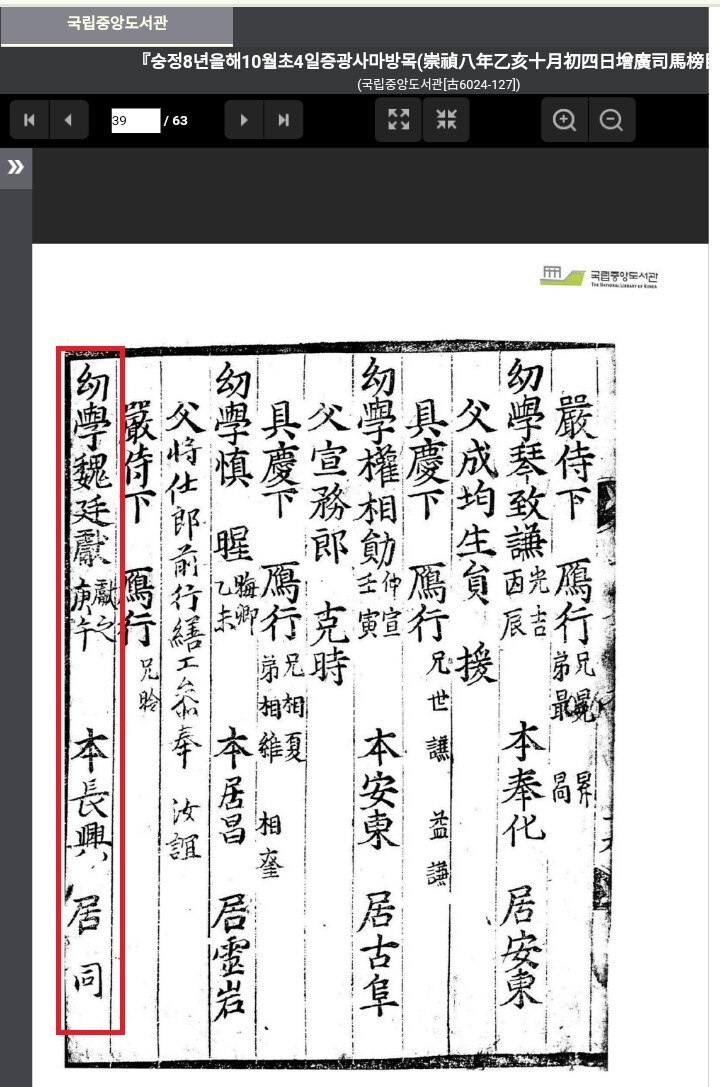 국천공의 사마방목 내용을 올립니다.자는 헌지, 태어난 해는 경오년(1570년), 본관은 장흥, 거주지는 장흥,아버지는 '증 통정대부 병조참의 행 통훈대부 진원현감 덕의' 영감하(부모 모두 돌아가심), 안항(형제) 없음이라는 내용입니다.