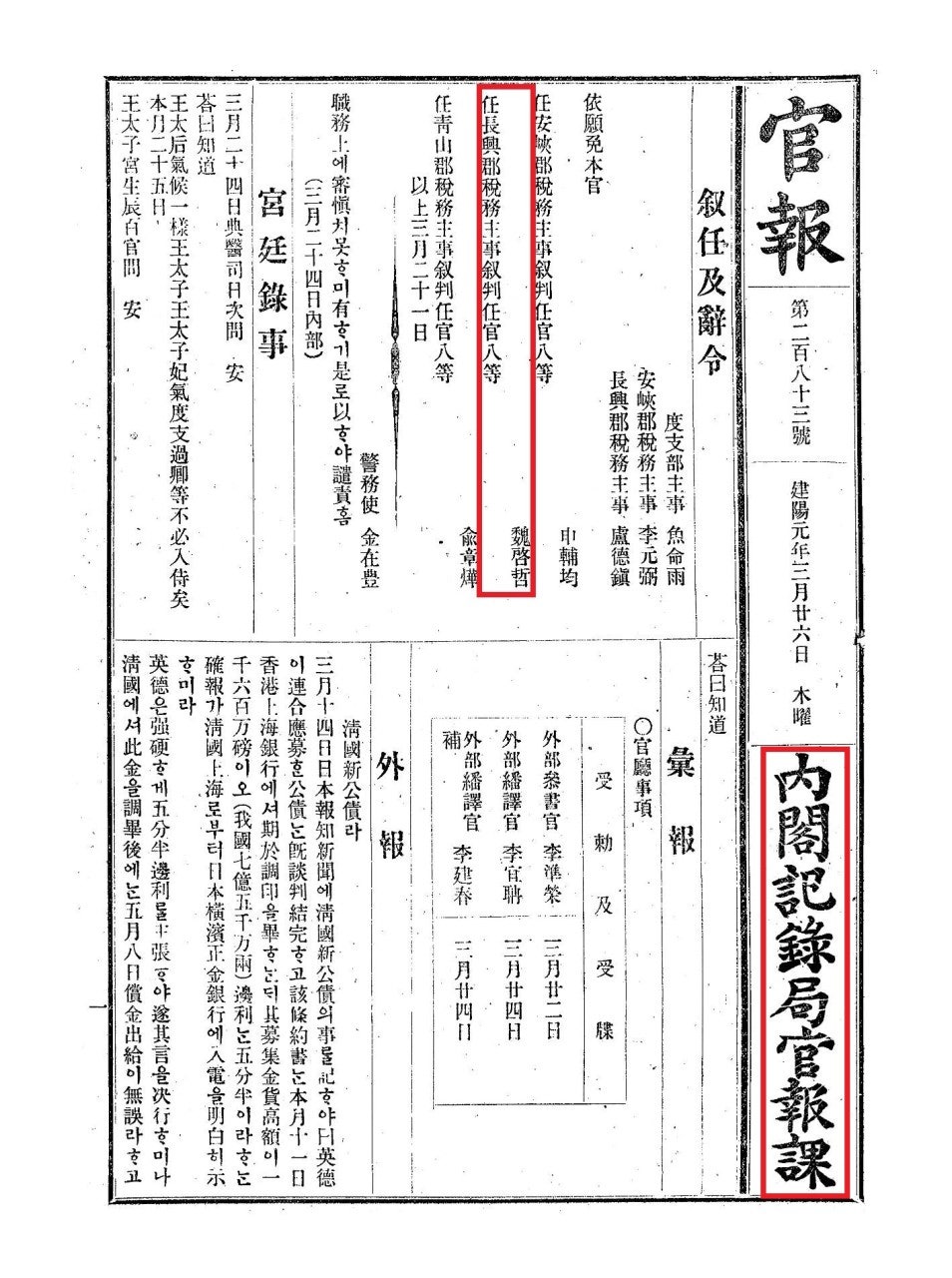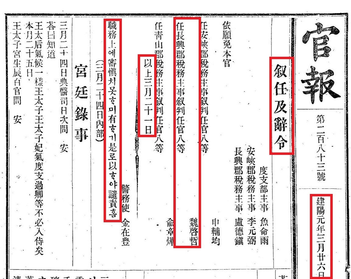 任長興郡稅務主事叙判任官八等 魏啓哲 (임 장흥군 세무주사 서 판임관 팔등 위계철)은 장흥군 세무주사로 직급은 판임관 팔등의 위계철을 임명한다.