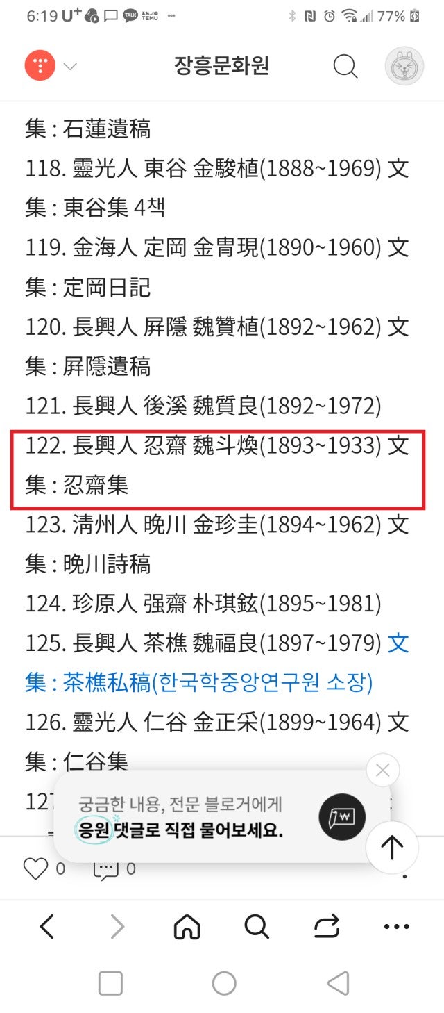 이어서 장흥문화원에 들렸는데 다행히 사무실에 직원이 있어서 도움을 받아 오래전에 만들어진 장흥사람들의 영인본 문집들 속에서 장흥위씨 행원출신 문집들을 찾기 시작했습니다...