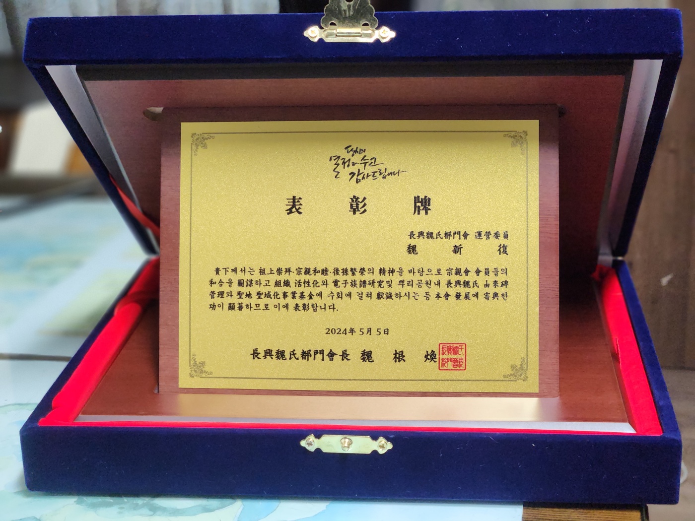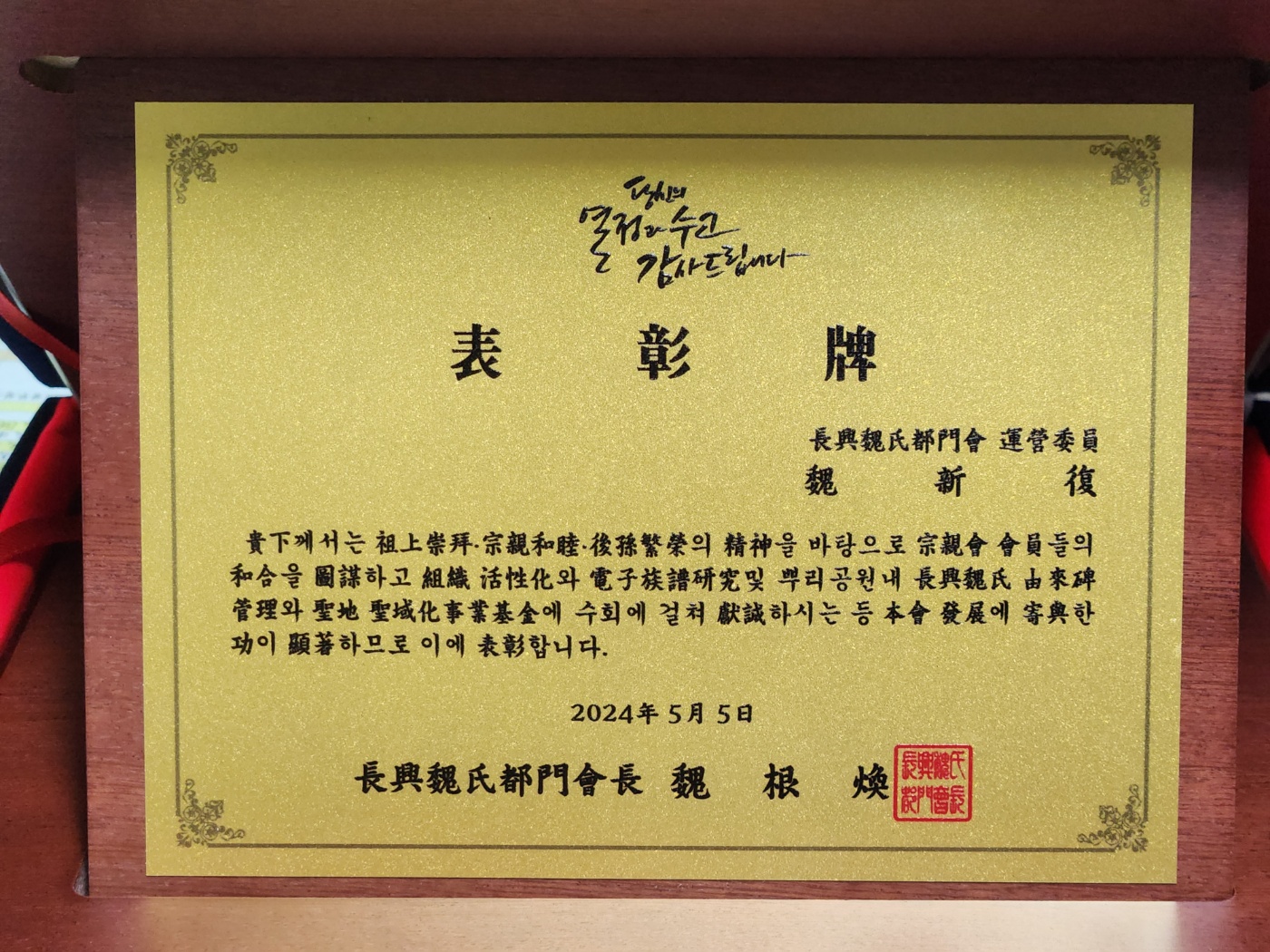 회주대제후에 열린 장흥위씨도문회 총회에서 위신복 종친에게 표창패가 수여되었다.