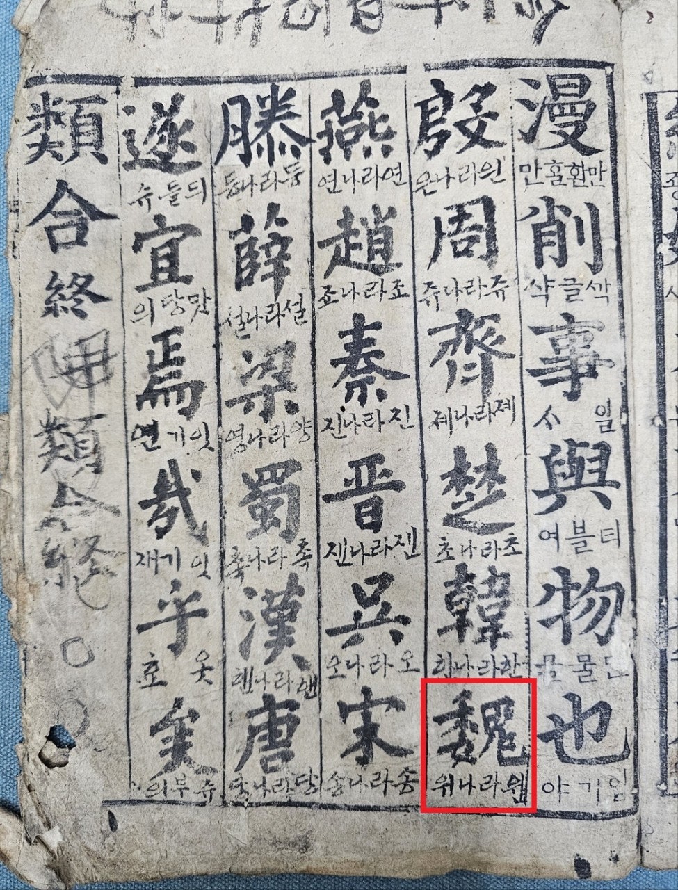 조선시대 한자학습서 '유합(類合)' 목판본에 씌여진 위나라위...