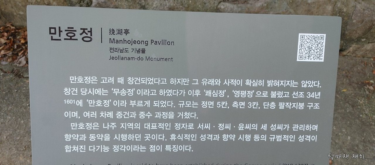 혹여라도 나주 남평에서 장흥방면으로 이동하시는 때면 찾아서 만호정 정자를 찾아본다면 바람 시원함과 함께 여러 감상에 빠지실 것입니다...