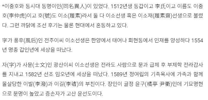 특이하게 1500년대 조선에는 호(이소재 履素齊)와 성명(이중호 李仲虎)이 같은 분이 두 분이 있었습니다... 두 분이 이소선생 또는 이소재라 호칭되었습니다...