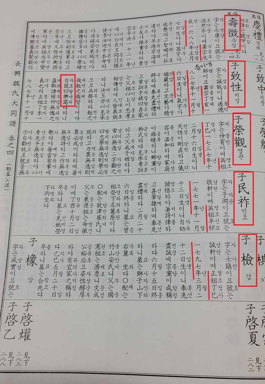 또한 1999년 기묘대동보에 '자호왈 낙와'로 되어 있는 부분도 1907년 삼수파 가승과 1957년 행원파보의 내용에 있는 '자호왈 삼락와(三樂窩)'로 수정하는 것이 맞을 것 같습니다... 1999년 기묘대동보에서 석삼자(三)가 누락된것으로 판단됩니다...