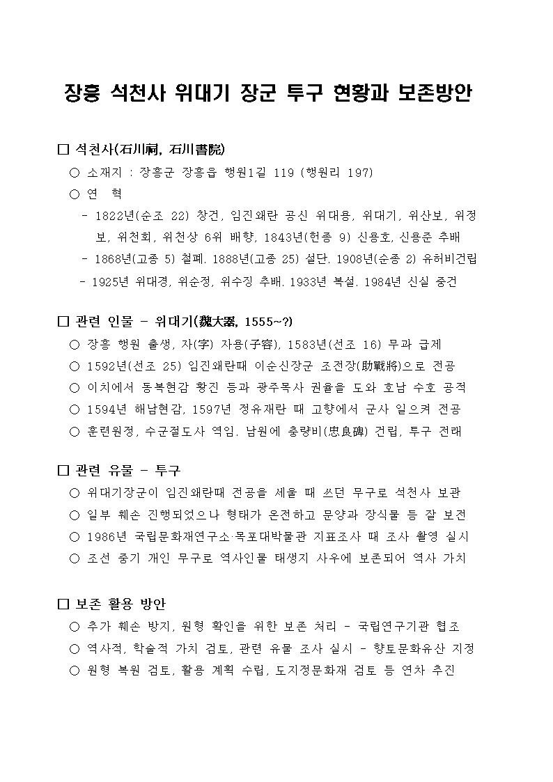2019년 장흥군과 국립나주박물관이 공동 주최한 ‘길이 길이 흥할 땅 장흥' 특별전시회(2019.06.14~09.01.)에 장흥위씨 문중의 많은 유물과 함께 전시되었다. 특별전시회가 끝난 뒤 장흥위씨행원문회는 장흥군청의 도움을 받아 훼손된 투구의 수리 및 보존에 대해 국립나주박물관(당시 관장 은화수, 학예실장 윤종균, 주무관 조연태)에 수리를 의뢰(2019.08.27)하였다.