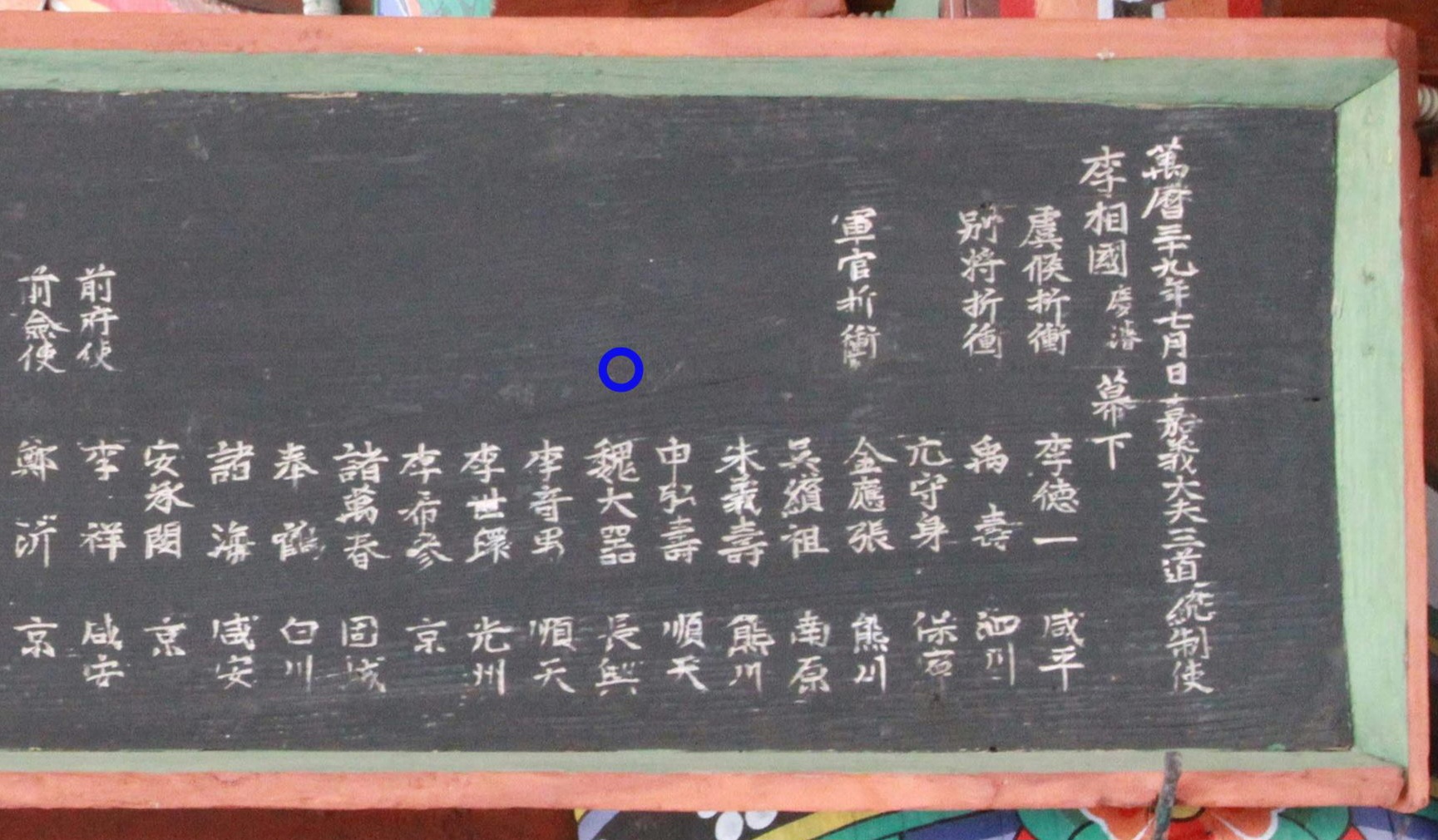 1611년(광해군 3)의 삼도수군통제영의 통제사(이경준)와 군관 명록 현판(국보 통영 세병관)(2013.12.31, 김상현박사 제공)