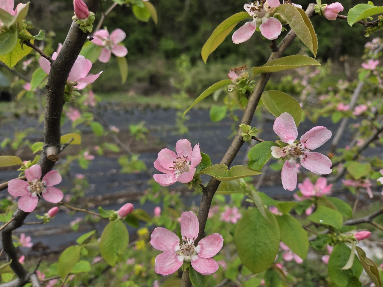 새로난 4차선도로는 쌩쌩 달리는 차량이 많지만 기존의 2차선 도로는 간혹 한 대씩 지나다니기 때문에 위험하지는 않습니다... 도로에서 본 단아한 모과꽃인데 몇년만에 봅니다...