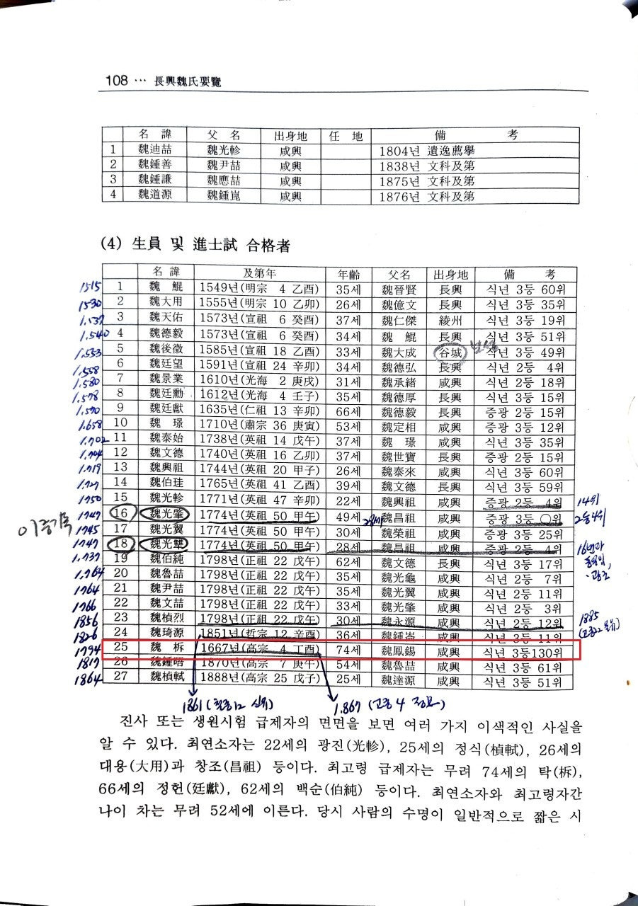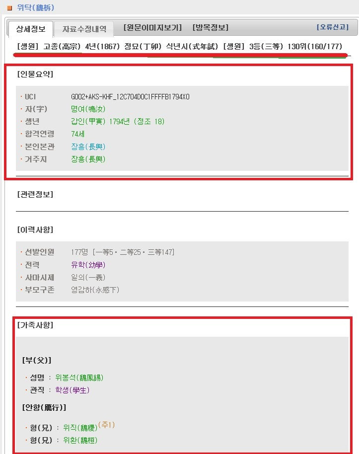 우선 입격년이 '증보 장흥위씨요람'에는1667년(고종4 정유) 거주지 함흥으로 기록했으나 한국역대인물정합정보시스템에는 고종 4년(1867년 정묘) 거주지 장흥으로 기록되어 있습니다.일부 오타이거나 사실확인이 부족한듯 보여집니다.