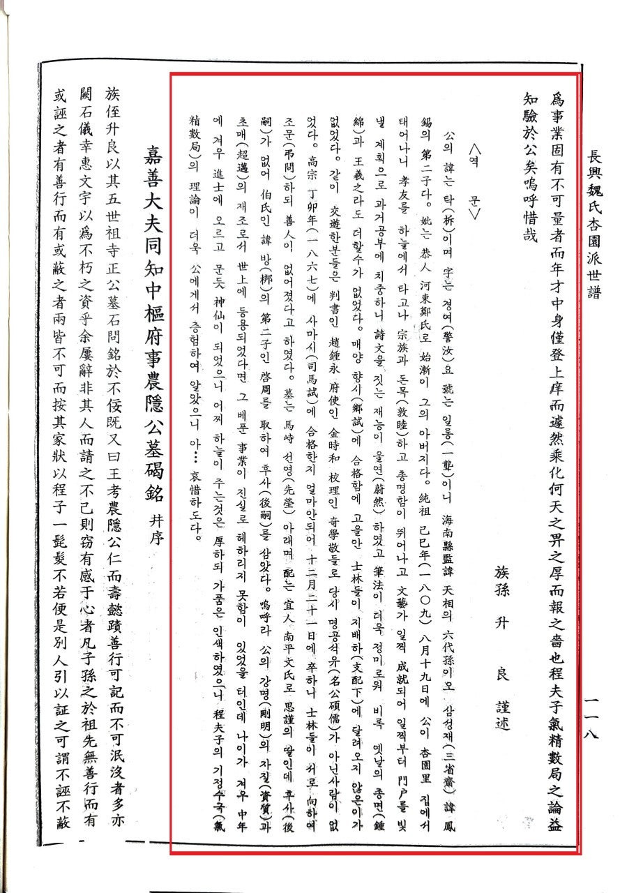 공의 휘는 탁이며 자는 경여요 호는 일롱이니 해남현감 휘 천상의 6대손이오 삼성재 휘 봉석의 제2자다. 고종 정유년(1867년) 사마시에 입격한지 얼마되지 않아 졸하였다라고 소개하면서 후사가 없어 백씨(휘 방)의 제2자(계주)를 취하여 후사로 삼았다.라고 족손 승량이 기록했습니다...위탁선조님은 장흥위씨 30세 행원문중 괴봉공파입니다...