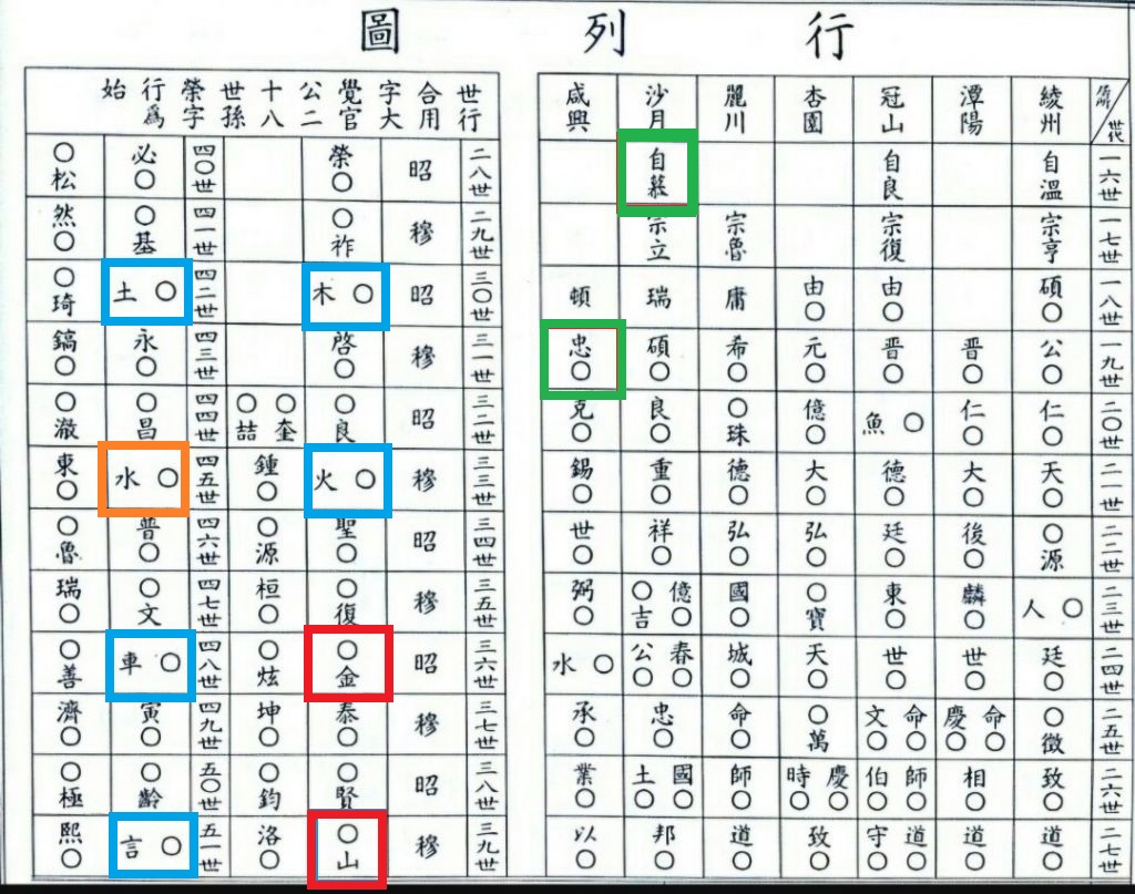 28세부터 51세까지의 항렬표에서 3세대마다 변하는 항렬(연파랑 빨강 주황색 네모)은 부수자와 공권(O)으로 이뤄졌는데 부수(部首)를 작게 공권을 크게 썼어야 합니다. 특히 붉은색 네모의 항렬은 세로가 아닌 가로로 표시되어야하며 주황색네모의 항렬은'水(물 수)+O"가 아닌 '氵(삼 수)+O''로 표시하는 것이 맞을 것 같습니다.