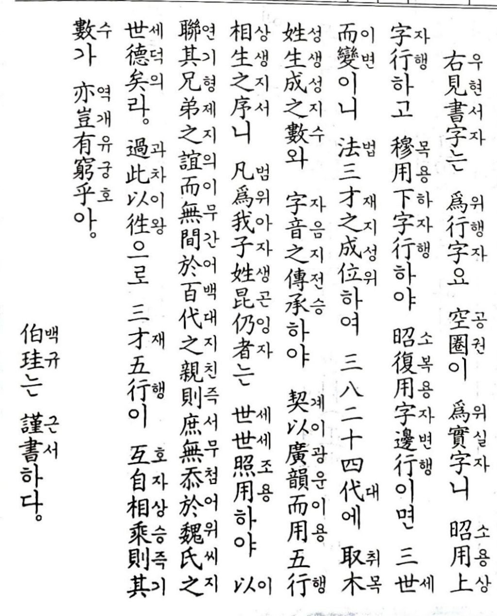 우측에 쓰인 글자는 항렬자요, 원으로 비어둔 곳이 실질적인 글자이니, 昭(위패를 좌측에 두는 세대)는 앞 글자를 항자로 쓰고, 穆은 뒷글자를 항자로 쓰며, 昭가 다시 행을 나란히 글자를 쓰면 3세대가 변한 것이니, 법에 삼재가 위치를 정하여 3×8=24대가 되면 목성(木姓)을 낳고 이루는 수를 취하고 자음을 전승해서 광운(廣韻)(운서)에 맞게하여 오행이 서로 태어나는 질서를 쓰니 무릇 내 자손, 형제는 대대로 이치에 맞게 사용한다면 백대의 친족에 간극이 없으니 위씨의 세덕에 더할 것이 없습니다(완벽하다). 이것이 지나 내려오며 삼재와 오행이 서로 절로 일어나니 그 수가 어찌 궁함이 있겠습니까?