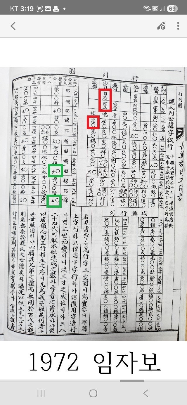 우선 녹색 네모는 1972년 임자보을 그냥 옮긴것으로 보입니다. 왜냐하면 16세 사월파조 성균생원공 휘 自恭(자공)이어야 되는데 自慕(자모)로 되어 있습니다. 또한 관북 19세는 'O충'이지만 '충O'으로 되어있습니다. 관북 19세는 휘 세충과 휘 신충 2분입니다.이것은 1972년 임자보의 오타를 그대로 옮긴것으로 보입니다.