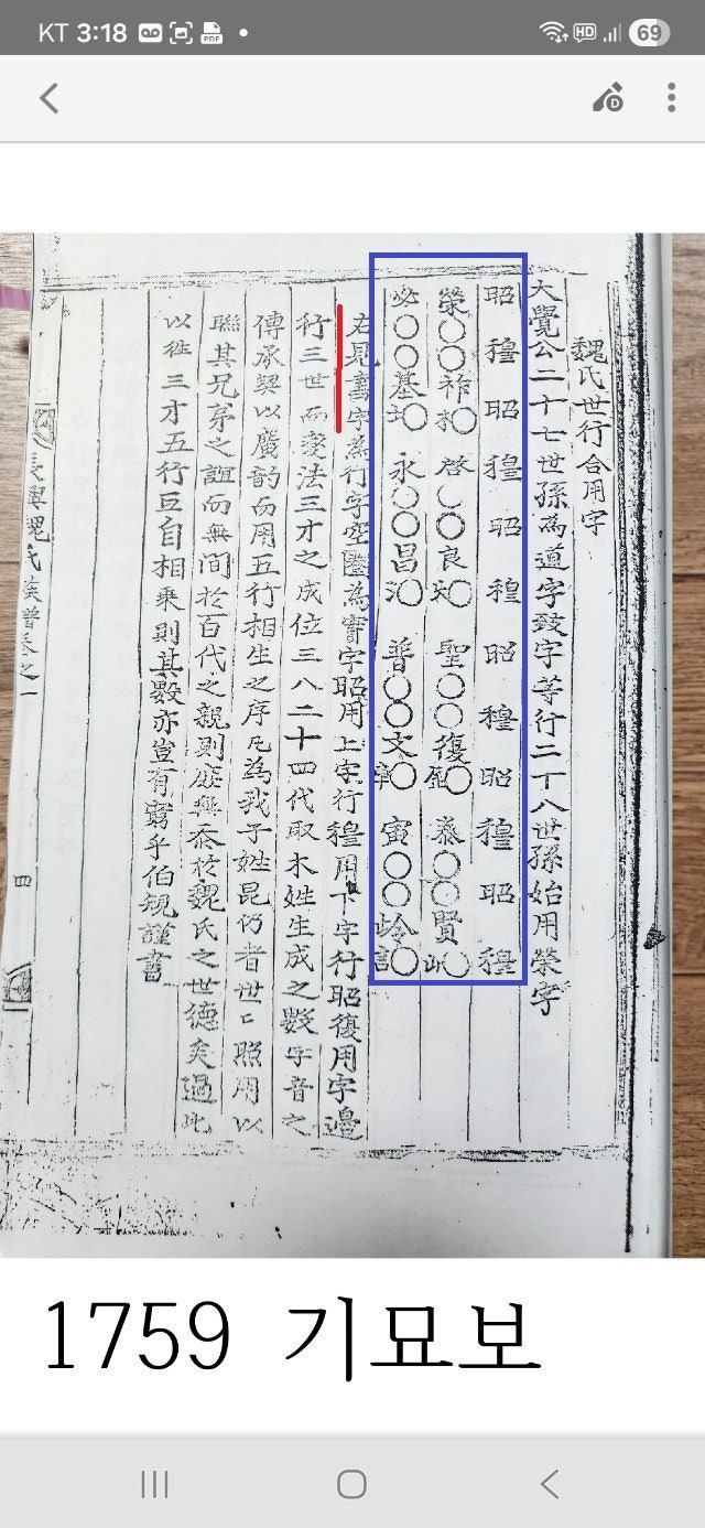 우측에 보이는 글씨라는 표현(右見書字)은 1999년 기묘대동보에는 함흥 항렬이 위치해 있지만 원래 1759년 기묘초보의 항렬도를 지칭합니다. 아래사진의 우측의 보이는 글씨(빨강색선)라는 표현은 1759년 발간된 장흥위씨 최초의 족보 기묘초보를 보면 확연히 이해가 됩니다...