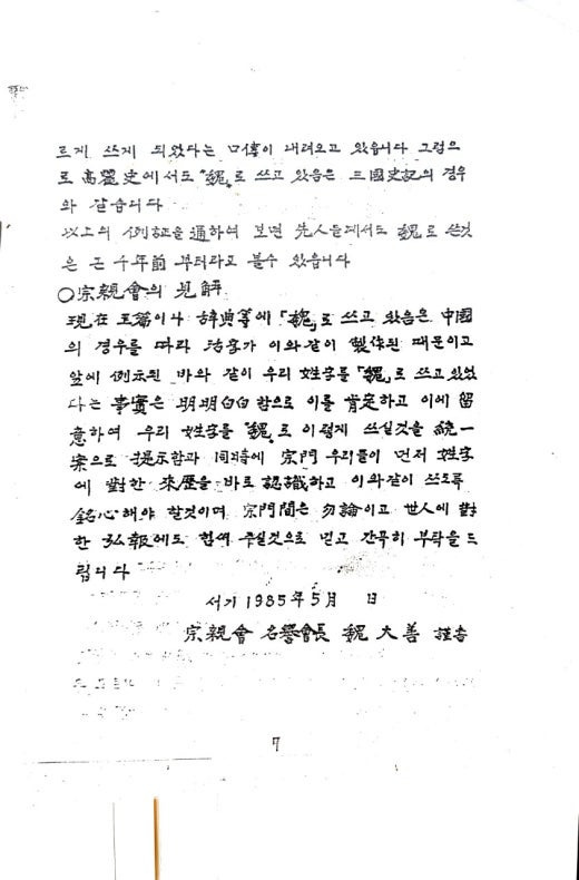 現在 王篇이나 辞典等에 「魏」로 쓰고 있음은 中國의 경우를 따라 活字가 이와같이 製作된 때문이고 앞에 例示된 바와 같이 우리 姓字를 「(성위)』로 쓰고 있었다는 事實은 “明明白白 함으로 이를 肯定하고 이에 留意하여 우리 姓字를 "魏(성위)"로 이렇게 쓰실것을 統一案으로 提示함과 同時에 宗門 우리들이 먼저 姓字에 對한 來歷을 바로 認識하고 이와같이 쓰도록 銘心해야 할 것이며 宗門間은 勿論이고 世人에 對한 弘報에도 힘써 주실 것으로 믿고 간곡히 부탁을 드립니다.