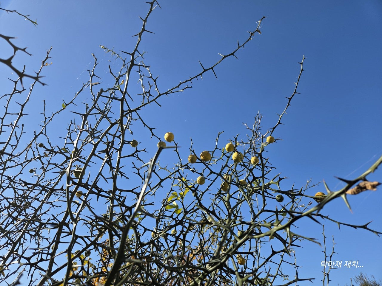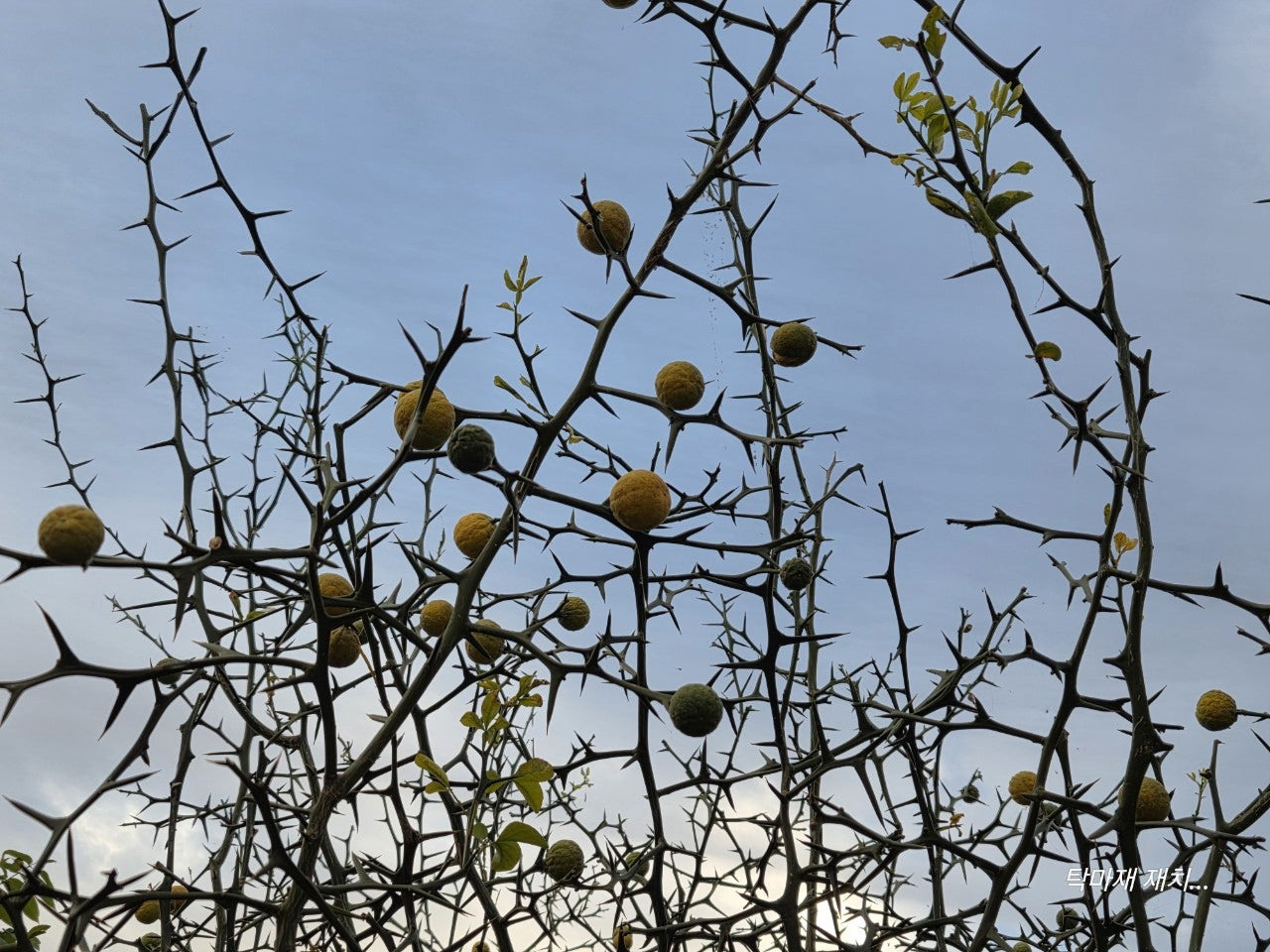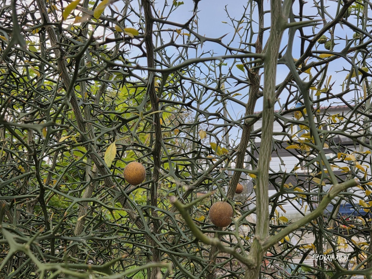 몇년전부터 탱자 열매를 주워다가 탱자씨를 받아서 봄에 화분에 씨를 뿌리면 콩나물처럼 발아합니다...그랬더니 5년전쯤 씨를 심어서 모종을 만들어 옮겨심은 탱자나무들이 작년에 첫번째 탱자 열매를 몇개 줬습니다...