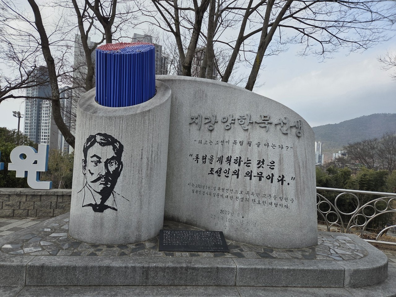남산공원 꼭대기에는 화순 군민회관이 있고 그앞에 독립선언 33인중에 한 분이신 지강 양한묵선생의 기념물이 있습니다.